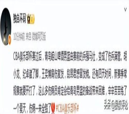 媒體人“獨自不同”發(fā)文點評:“CBA俱樂部杯賽過后,青島嶗山啤酒男籃由賽前的兵強馬壯,變成了傷兵滿營。胡小龍、紀卓崴了腳,王奕博肩傷復發(fā),段昂君感冒發(fā)燒。還有四天時間,新賽季常規(guī)賽就要開打了,這么多傷病員肯定會給青島男籃的備戰(zhàn)帶來困難,辛辛苦苦練了一個夏天,傷病一來全毀了”。