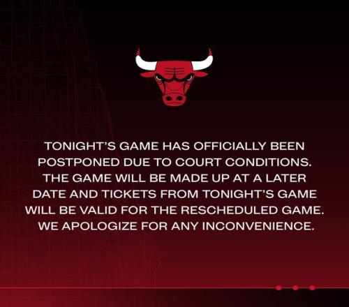 “由于場地狀況原因,今晚的比賽已正式延期。比賽將于稍后日期補賽,今晚比賽的門票在補賽時依然有效。對于由此帶來的不便,我們深表歉意。”公牛在官方聲明中寫道。