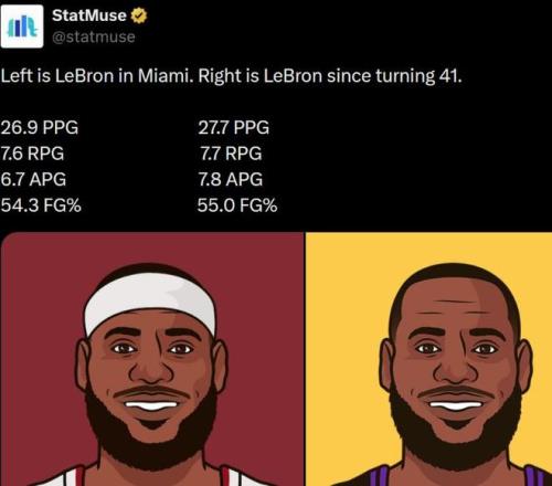 根據(jù)美國媒體StatMuse數(shù)據(jù),在熱火時期,詹姆斯場均26.9分7.6籃板和6.7次助攻,而41歲以后的詹姆斯場均27.7分7.7籃板和7.8次助攻,命中率也熱火時54.3%提升到55%。